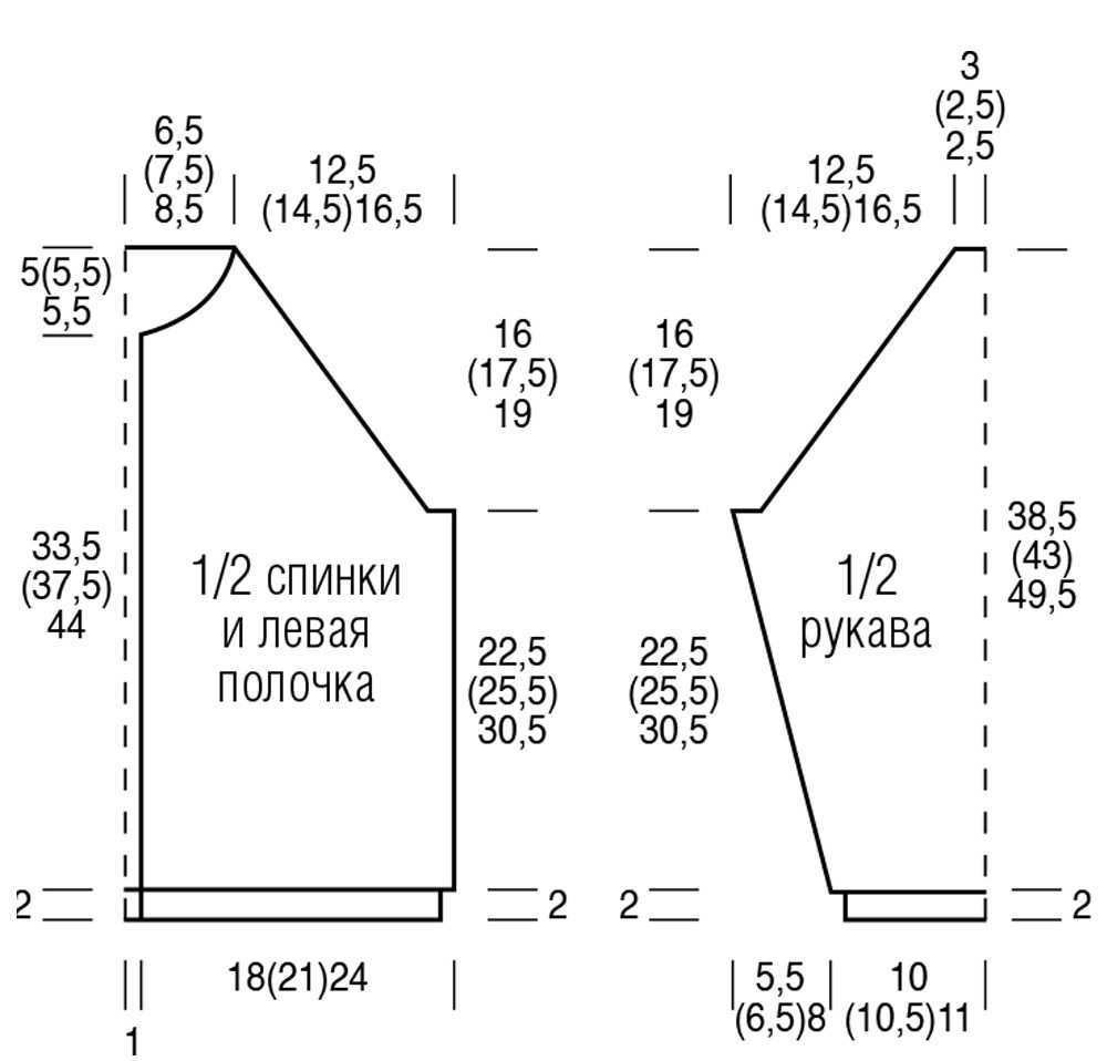 - Сделать рукава (по 14 рядов каждый). Вязать лицевым полотном, «резинкой», жемчужным узором.