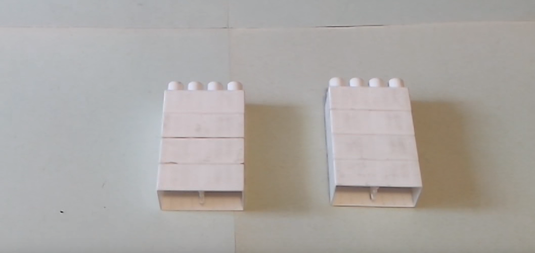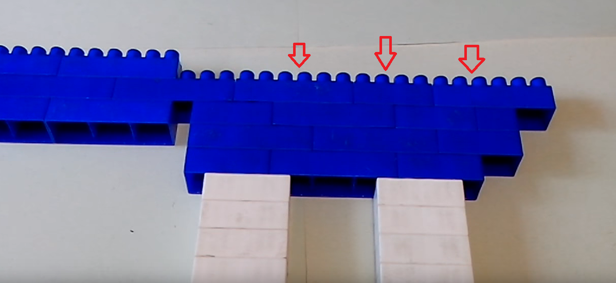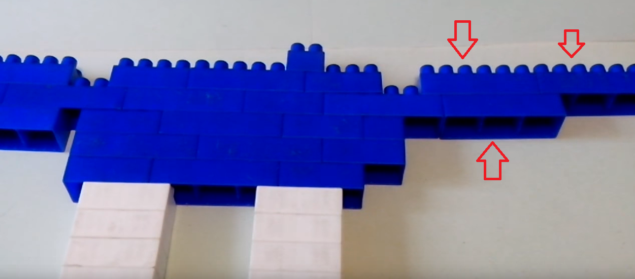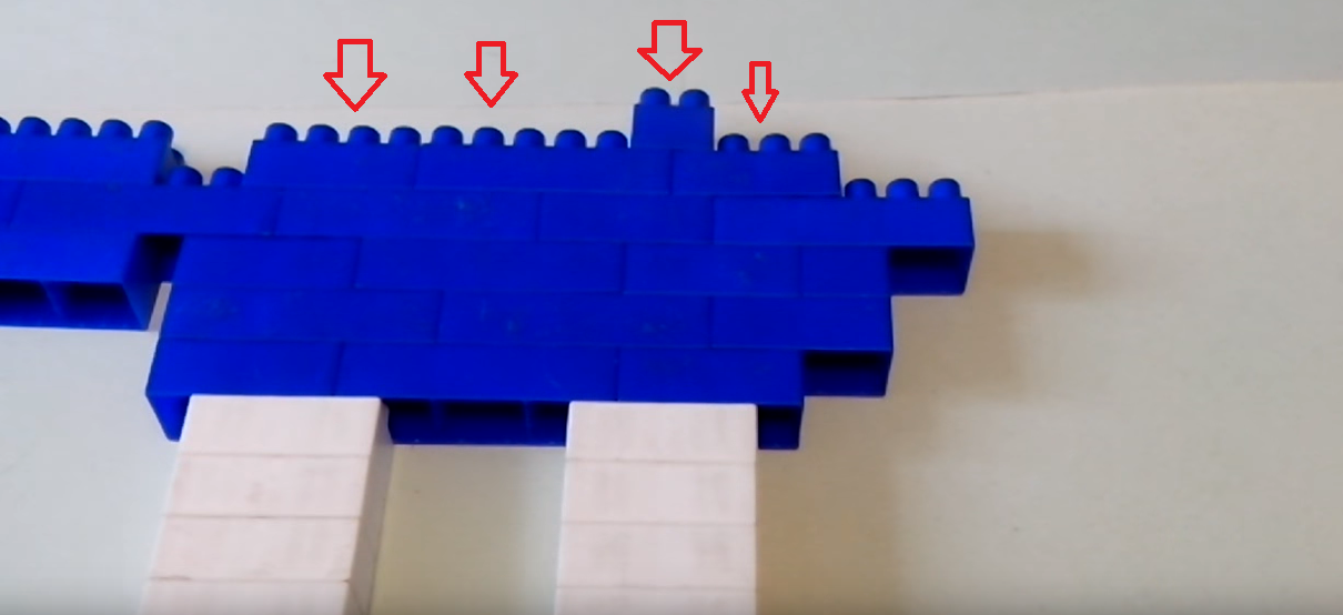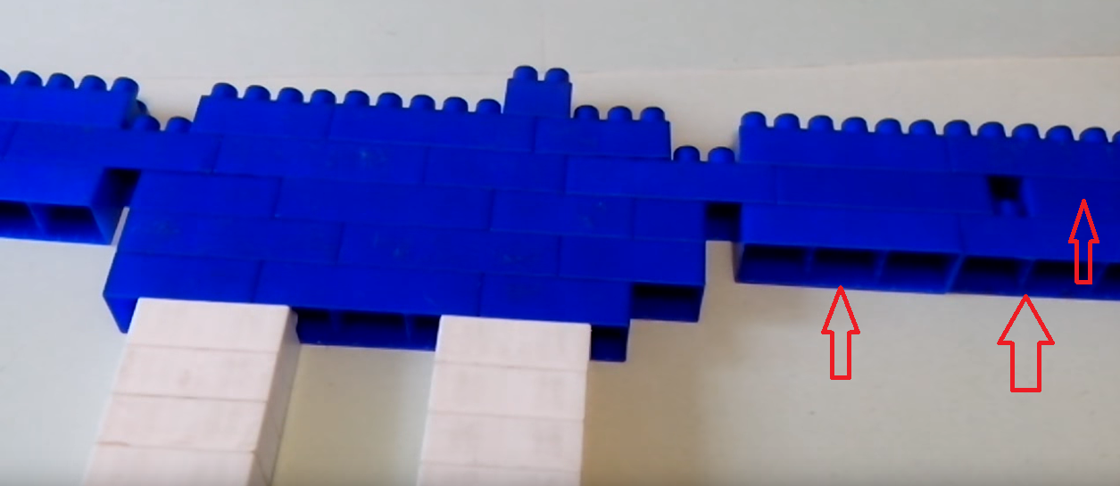 На этом рисунке изображена простая конструкция с обратной стороны: продемонстрировано, как именно трубки скреплены с шипами. Детали различаются по виду трубок. Например, на самом тонком (см. рис 1.5, вверху) трубки укорочены, а у кубика 2×4 (см. ниже) они более длинные. На кубике 1×4 (в самом низу конструкции) вместо полых трубок — тонкие столбики.