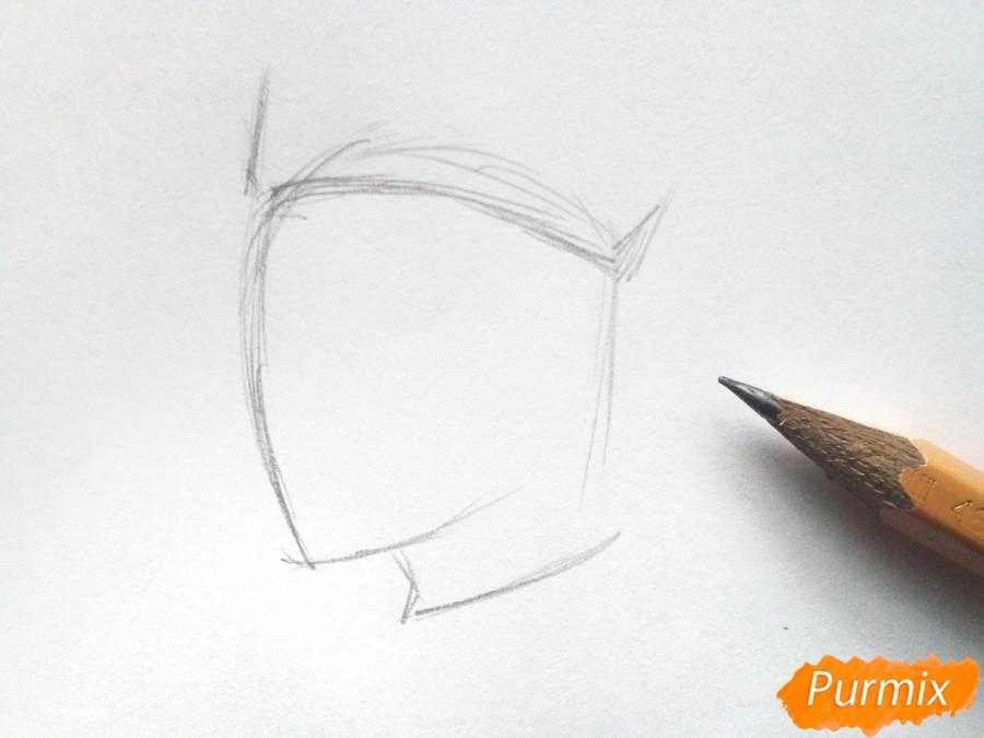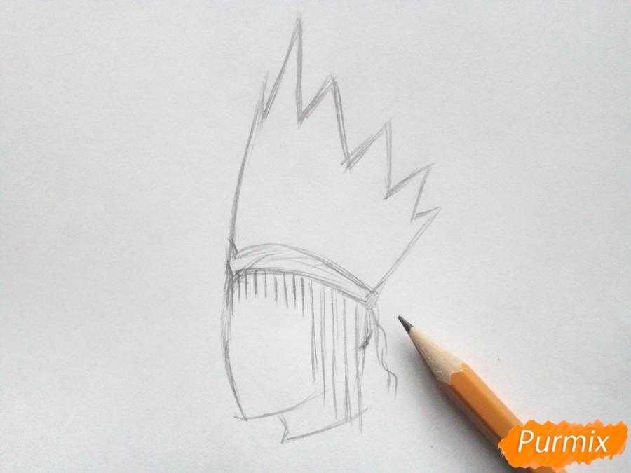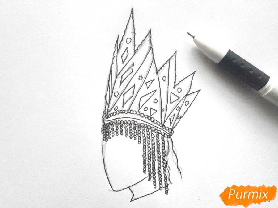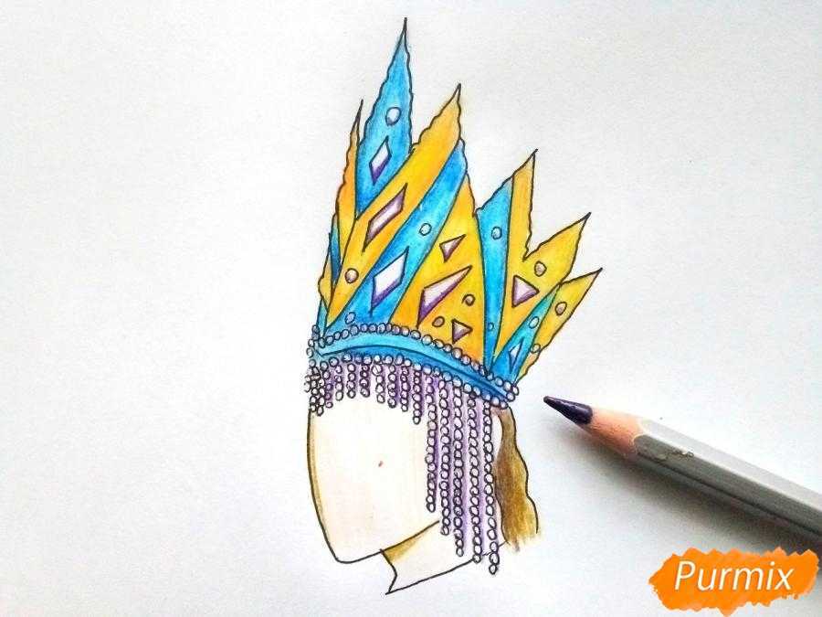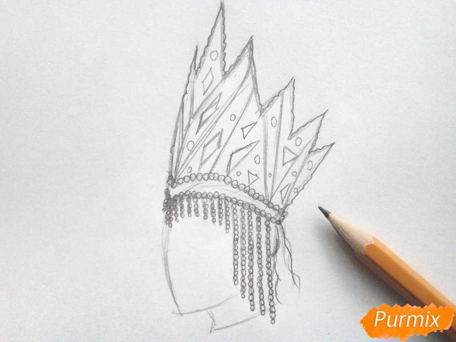 Рисуем высокую корону с острыми краями. Самая высокая часть будет спереди (лобная часть), а потом постепенно уменьшается. Внизу короны будут свисать украшения. Наметим их вертикальными линиями.