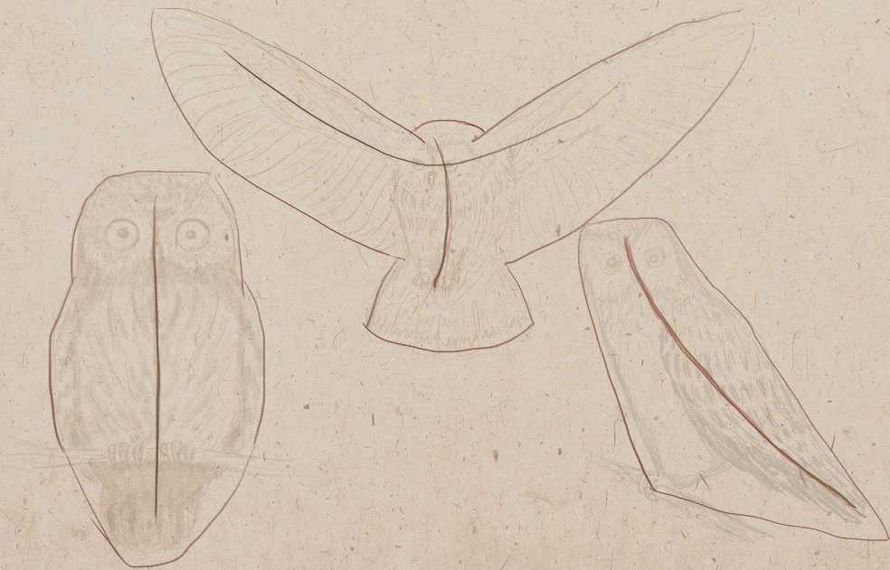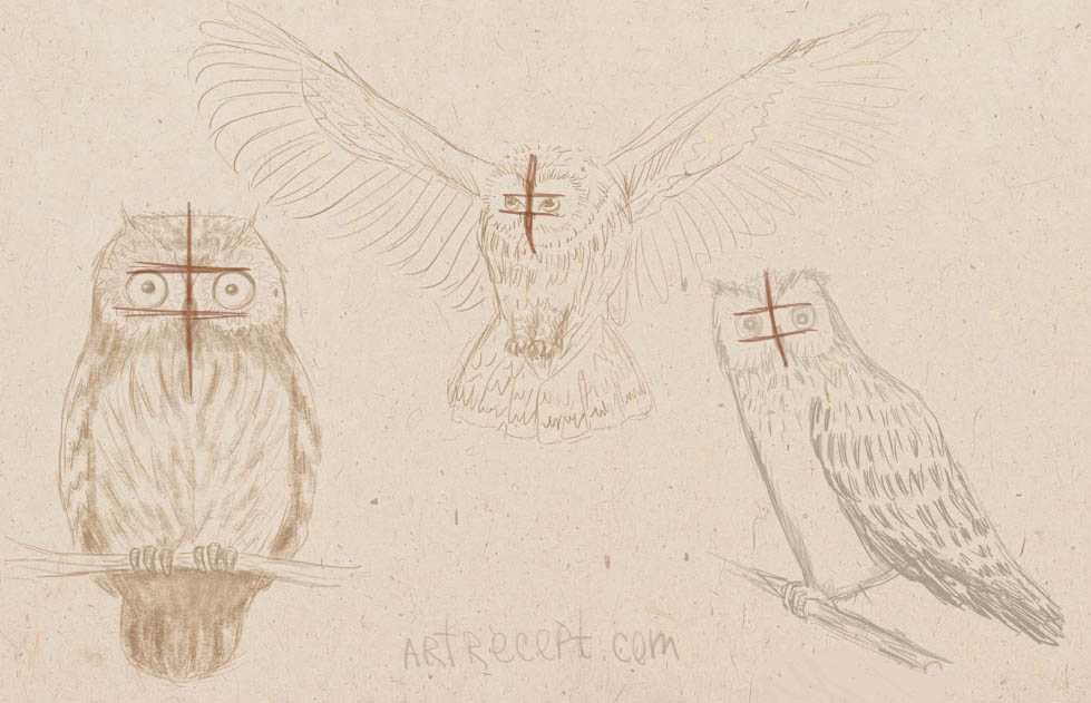 Давайте немного усложним нашу задачу и попробуем изобразить сову в нескольких ракурсах, рассмотрим как рисовать ее портрет, лапы, крылья и перья.