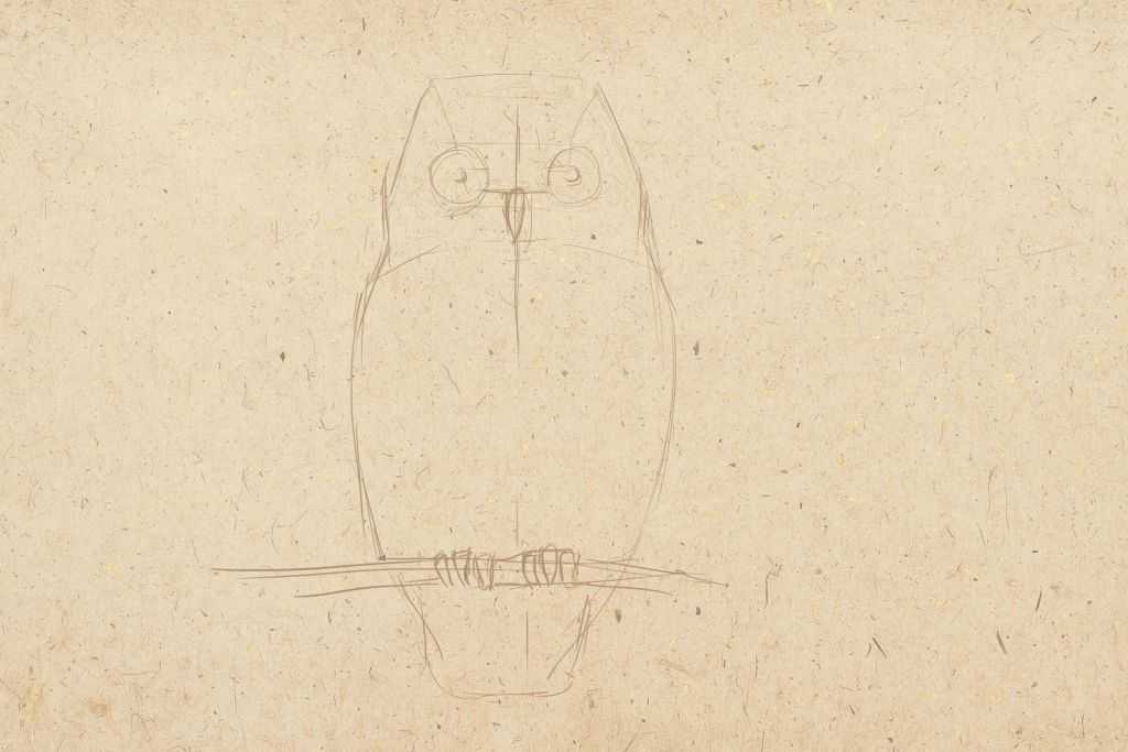 - тело совы очерчивается яйцевидным овалом, низ фигуры должен быть более широким, тогда на нем будет удобно расположить крылья и лапки птицы;
