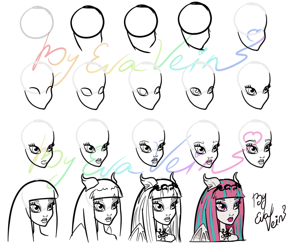 Лицевая анатомия имеет общие черты. Лицевая часть занимает чуть более половины головы, лоб, как правило, высок. Попробуем разобраться, как нарисовать лицо Монстер Хай на примере Дракулауры.