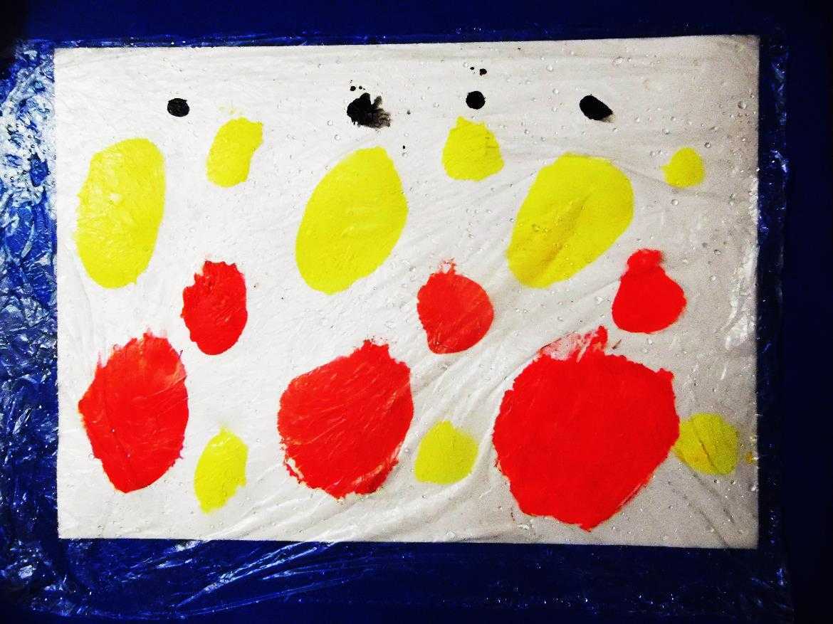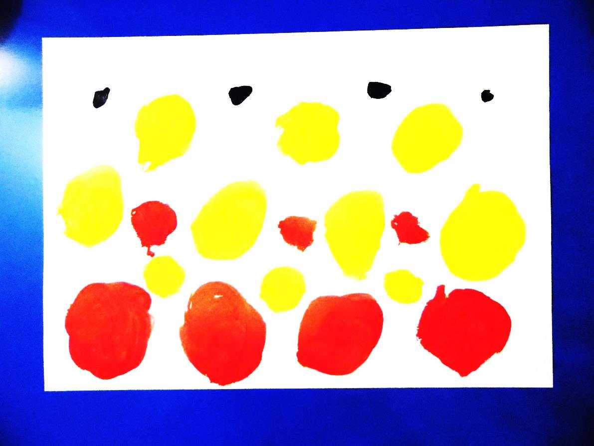 2. Кистью в нижней части листа наносим красной гуашью большие пятна, чуть выше -желтой гуашью, в верхней части — небольшие пятна гуашью черного цвета. Добавляем несколько небольших пятен желтой и красной гуашью в свободном месте.