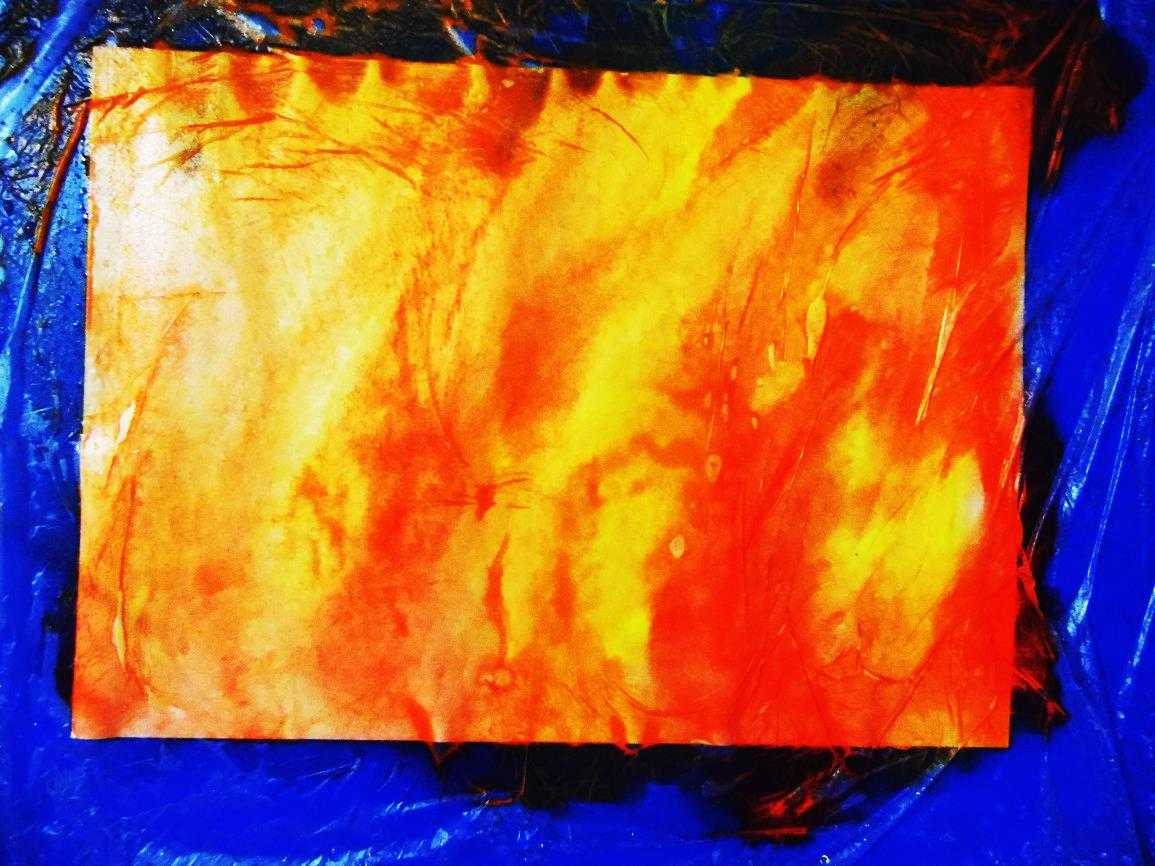 3. Отжимаем кусок целлофана и, не давая гуаши высохнуть, расправляем влажную пленку на листе бумаги.