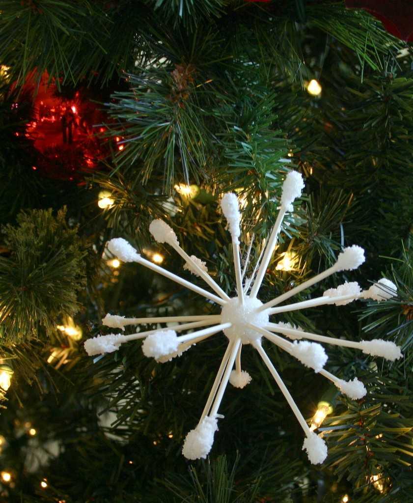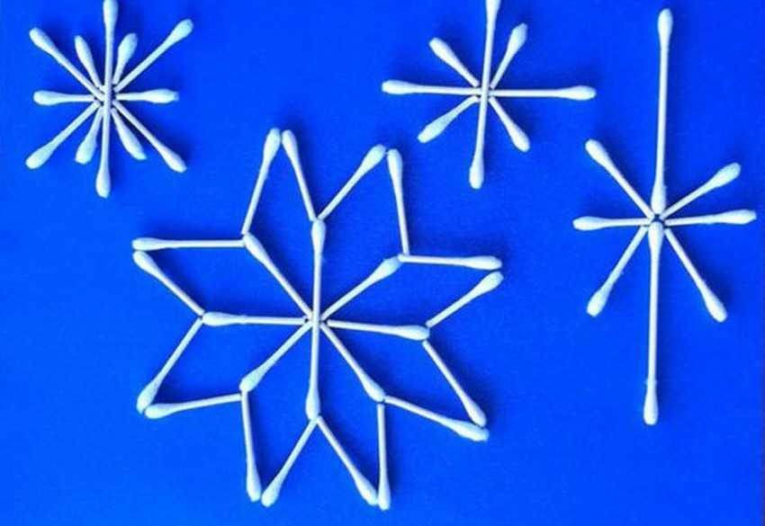 Если немного пофантазировать, то к длинным лучам снежинки можно приклеить головки ватных палочек, чтобы лучи снежинки были пушистее.