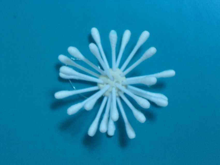 - Намазываем клеем кружок-серединку и приклеиваем ватные палочки — 8 палочек равномерно и 8 половинок между ними.