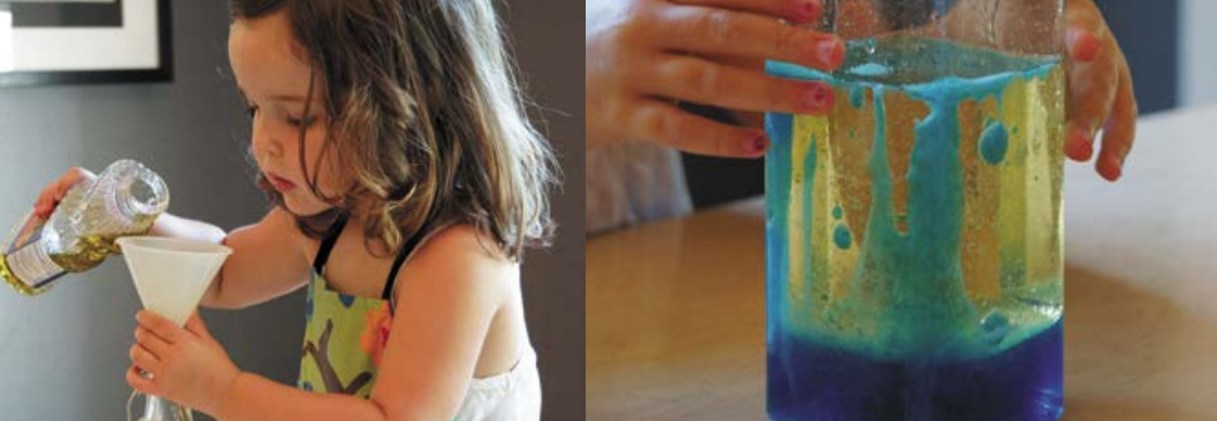 Выложите инструменты и материалы на стол и попросите ребенка помочь вам наполнить бутылку растительным маслом примерно на три четверти объема. При необходимости используйте воронку. Последнюю четверть долейте водой, оставив незаполненными 3–5 см на самом верху. Подождите, пока вода опустится на дно бутылки.