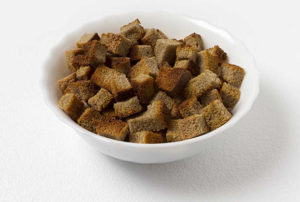 Если поджарить ржаные сухарики на масле с солью, получится не слишком полезно. Поэтому мы так делать не будем. Да в этом и нет особой нужды, так как ржаной хлеб сам по себе чуть-чуть солоноватый. Для усиления вкуса сухариков можно добавить пряности: сладкую венгерскую паприку, немного чёрного или красного перца, молотый кумин или тмин, интересно получится с корицей. Подсушить сухарики можно в духовке, если вчерашний-позавчерашний хлеб мелко нарезать, то это не займёт много времени.