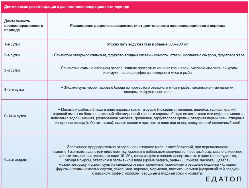 Диета по дням после прописывается с третьих суток. Пациента отпускают домой, снабдив предписаниями врача-гастроэнтеролога. В этот период требуется: