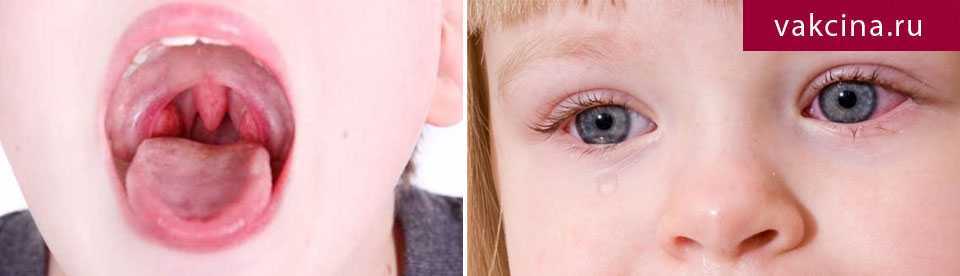 Катаральные проявления (покраснение, наличие воспаления) верхних дыхательных путей и конъюнктив также определяются в первые сутки заболевания. Проявляется это такими симптомами: покраснение горла, твердого и мягкого неба, миндалин, рыхлость задней стенки глотки, конъюнктивит, насморк, незначительный кашель. У детей часто бывает две волны, кишечная и катаральная, которые сменяют друг друга.