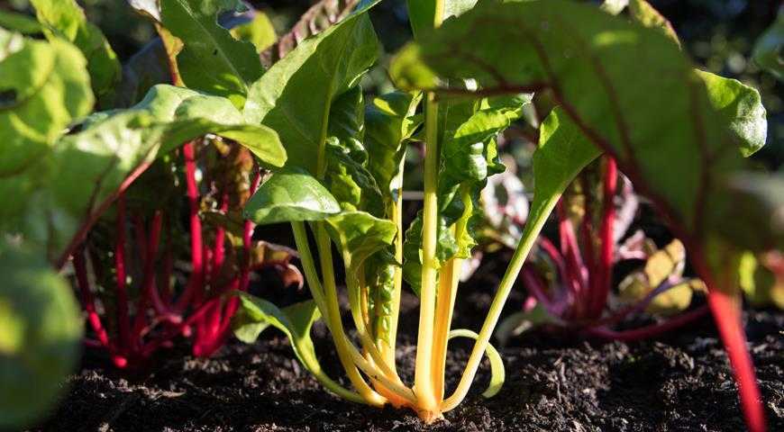 Мангольд Алый — среднеспелый с фиолетово-зелеными листьями и малиново-красными черешками.