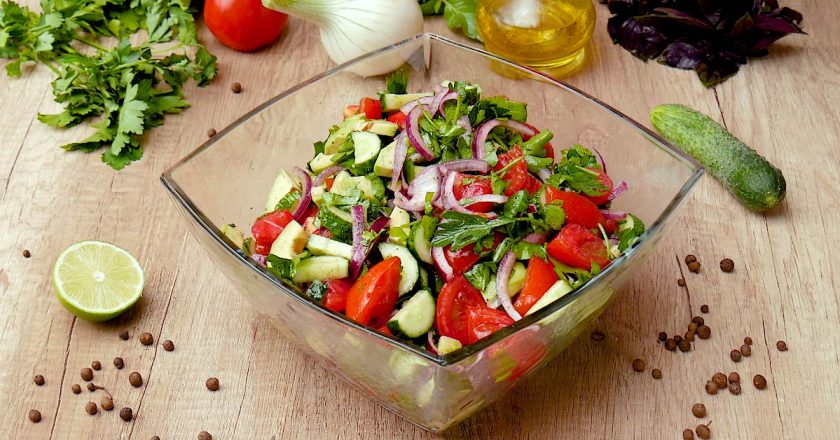 - Сбрызнуть салат соком лимона и добавить ложку оливкового масла. Перемешать.