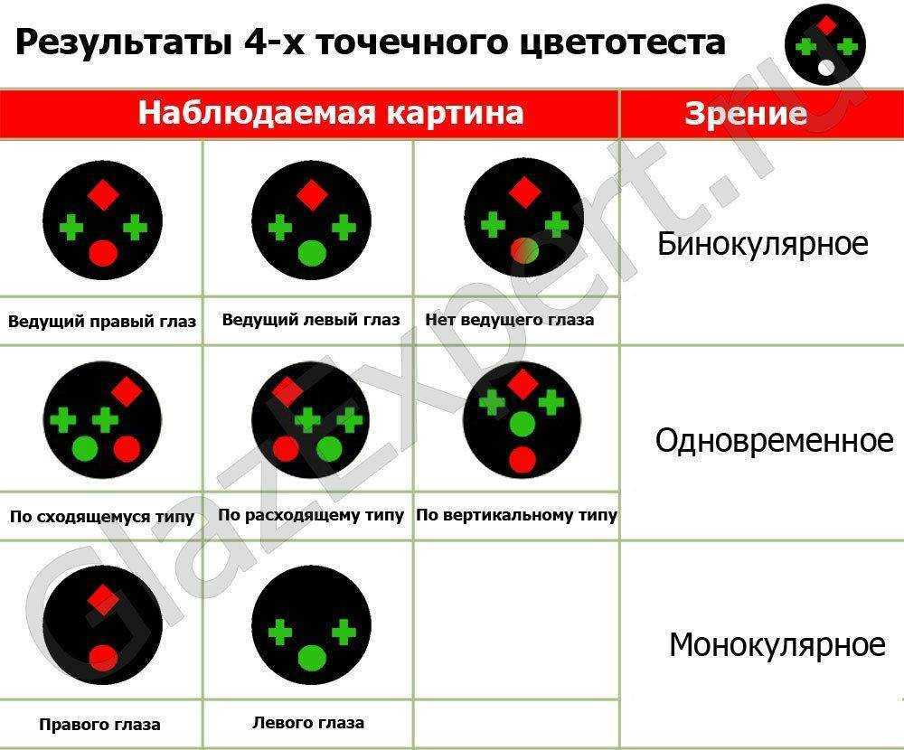 Наиболее точное исследование бинокулярного зрения производят с помощью четырехточечного цветотеста. Он основан на том, что зрительные обзоры можно разделить, используя цветные фильтры. Для этого нужно два предмета, которые окрашены в зеленый цвет и по одному красной и белой окраской. На исследуемого нужно надеть очки, с одним красным, а другим зеленым стеклом.