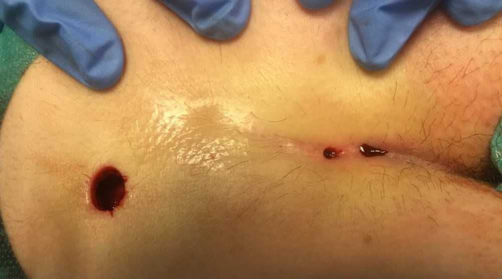 В случае наличия у пациента только первичных ходов, а так же при отсутствии затеков и дополнительных ходов или ответвлений, согласно дополнительным методам обследования возможно проведение малоинвазивной операции – синусэктомии. Эта операция подразумевает собой очень экономное иссечение эпителиальных ходов с помощью скальпеля с оставление кожных мостиков между первичными ходами. Это позволяет максимально быстро вернуться к работе, получив отличный косметический результат (рис.9).