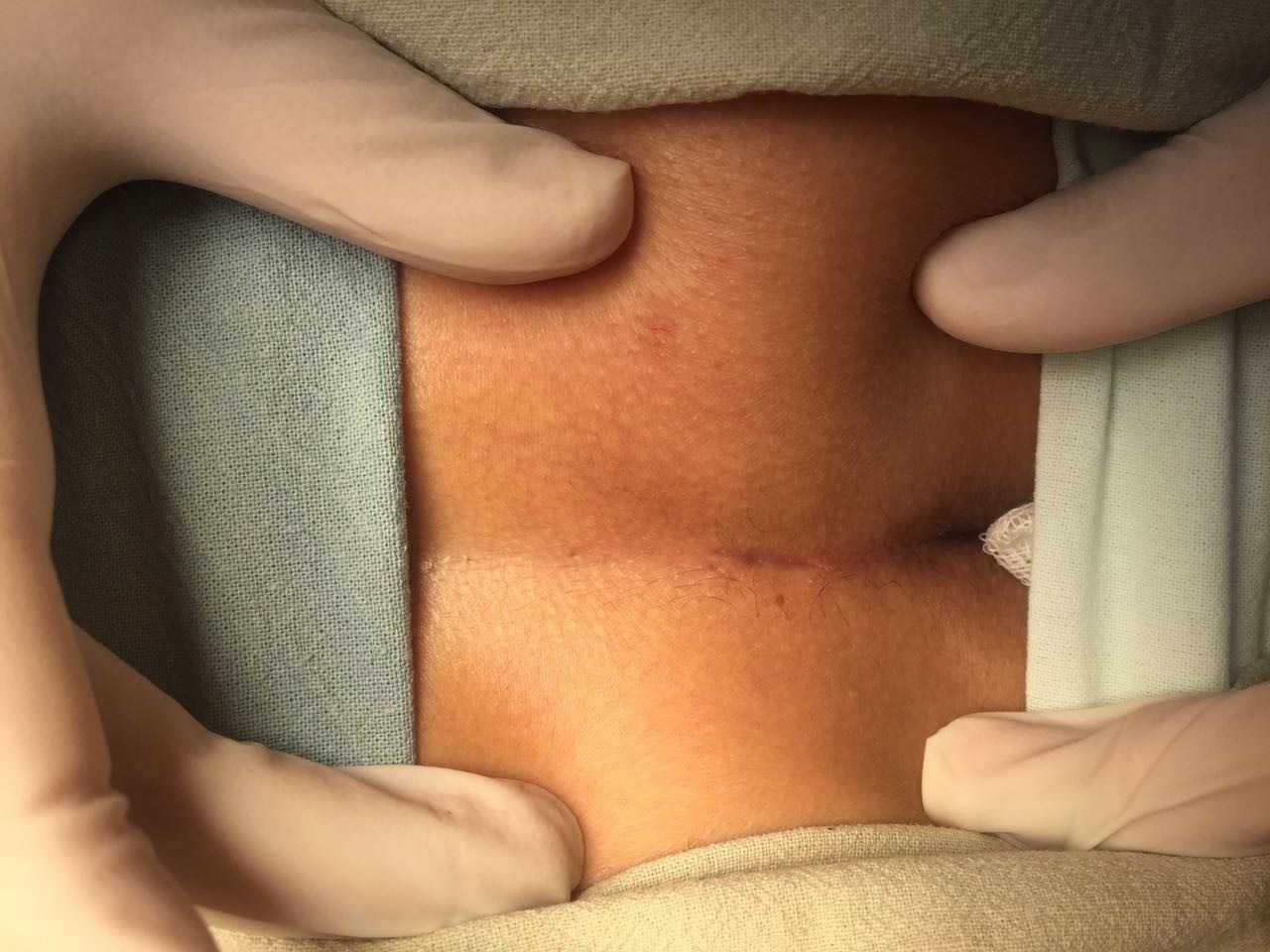 При развитии воспалительной реакции, чему обычно предшествует закупорка наружного отверстия, эпителиальный копчиковый ход сначала проявляется болезненным уплотнением на коже в области межъягодичной складки (важно знать, что иногда, особенно при длительном отсутствии адекватного лечения, свищевые ходы могут приобретать причудливые формы и появляться за пределами указанной области (рис. 2)