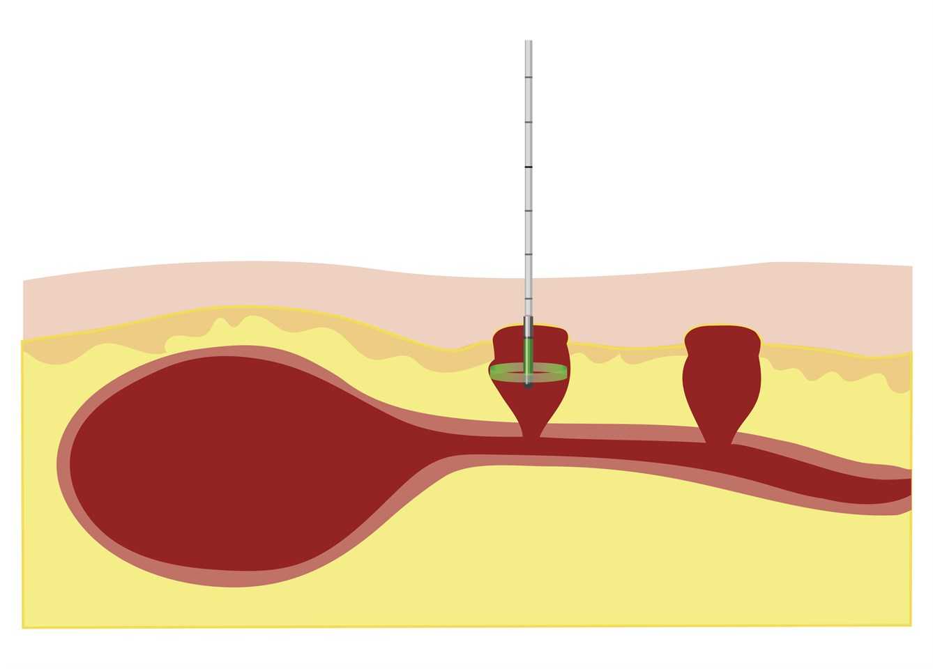 Суть операции состоит в обработке первичных ходов ЭКХ при помощи лазера. Это позволяет разрушить ходы ЭКХ и предотвратить развитие осложнений этого заболевания. Для операции используется лазер с определенной длиной волны в непрерывном режиме. В ходы ЭКХ луч лазера доставляется с помощью светодиода (рис.10). Мощность лазера может составлять от 1,5 до 3 Вт. Общая длительность работы составляет от 5 до 25 минут и зависит от стадии болезни, длины копчикового хода. Благодаря способности концентрировать своё действие только на поражённых тканях, процедура является малоинвазивной, сопровождается минимальным болевым синдромом. Помимо этого, лазер обладает коагулирующим свойством, тем самым он позволяет минимизировать возможность возникновения кровотечения из затронутых сосудов.