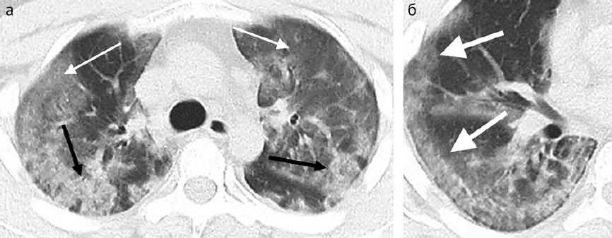 29-летний мужчина с неизвестным эпидемиологическим анамнезом, поступил с жалобами на лихорадку, кашель и был сразу направлен в отделение интенсивной терапии. (a) Аксиальный тонкосрезовый КТ-скан без введения контрастного препарата демонстрирует диффузные области уплотнения по типу «матового стекла» сливного характера с двух сторон (белые стрелки) и зоны консолидации (черные стрелки). (б) Аксиальный КТ-скан без введения контрастного препарата показывает, что изменения в правой средней и нижней долях имеет тенденцию к периферической локализации (стрелки).