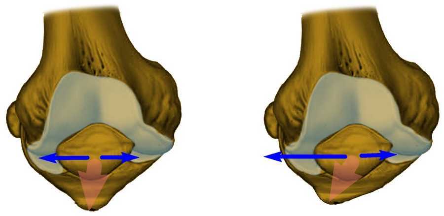 При нормальном, строго центрированном положении коленной чашечки в бороздке (мыщелке), тяга внутренней и наружной связок строго сбалансирована. В случае возникновения дисбаланса (например, при серьезных повреждениях и разрывах связки) надколенник будет смещаться кнаружи вследствие отсутствия компенсации тяги наружной связки.