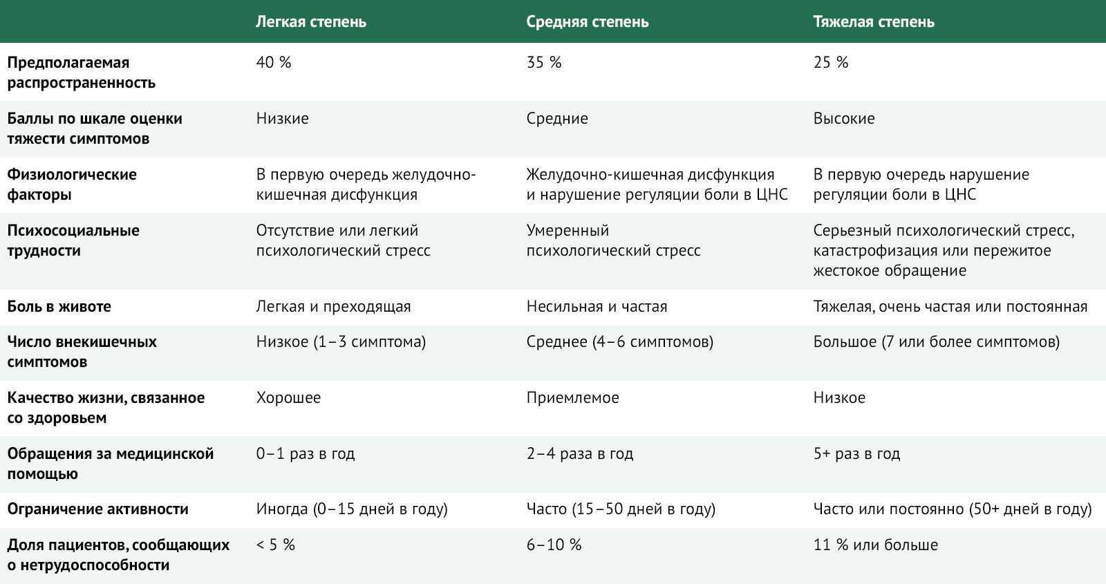 Степень тяжести — это биопсихосоциальная комбинация жалоб пациента на желудочно-кишечные и внекишечные симптомы, степени боли, инвалидности, психосоциальных нарушений, восприятия болезни и связанных с болезнью поведения и изменения качества жизни . Степень тяжести имеет значение при принятии решения о лечении. Например, пациент, имеющий нечастые слабо выраженные боли в животе без каких-либо других симптомов и без психологического стресса, вряд ли обратится за лечением, и даже в случае обращения его симптомы будут определены как легкие, не требующие лечения. И наоборот, пациент, страдающий сильной болью в животе, наряду с фибромиалгией и мигренью, который не может работать, находится в депрессии и часто обращается за медицинской помощью или же госпитализирован, будет считаться страдающим тяжелыми симптомами и подвергаться лечению поведенческими методами и множественными медицинскими процедурами. Авторы статьи представляют руководство, разработанное рабочей группой Римского фонда, для оказания помощи в классификации степени тяжести ФН ЖКТ (таблица 2) .