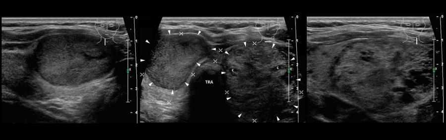 Размеры опухоли являются переменными. Мы часто сталкиваемся с небольшими (до 1 см) злокачественными узлами, которые нельзя тестировать вручную (не пальпируемые узелки). Наиболее распространенным из злокачественных процессов является папиллярный рак (50-80%).