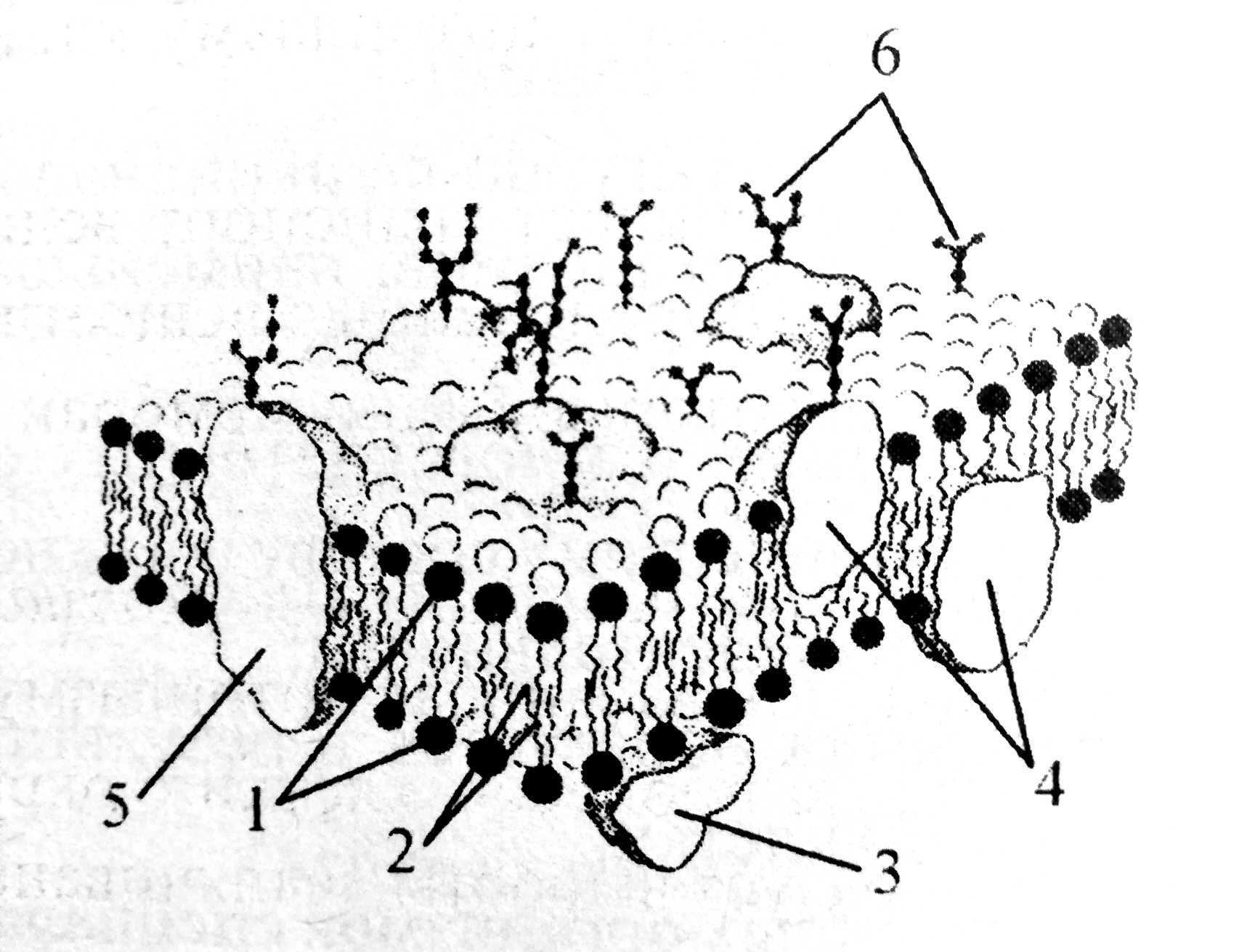 Схема строения биологической мембраны: 1 — гидрофильные концы липидных молекул; 2 — гидрофобные концы липидных молекул; 3 — периферические белки; 4 — полуинтегральные белки; 5 — интегральные белки; 6 — гликокалис.