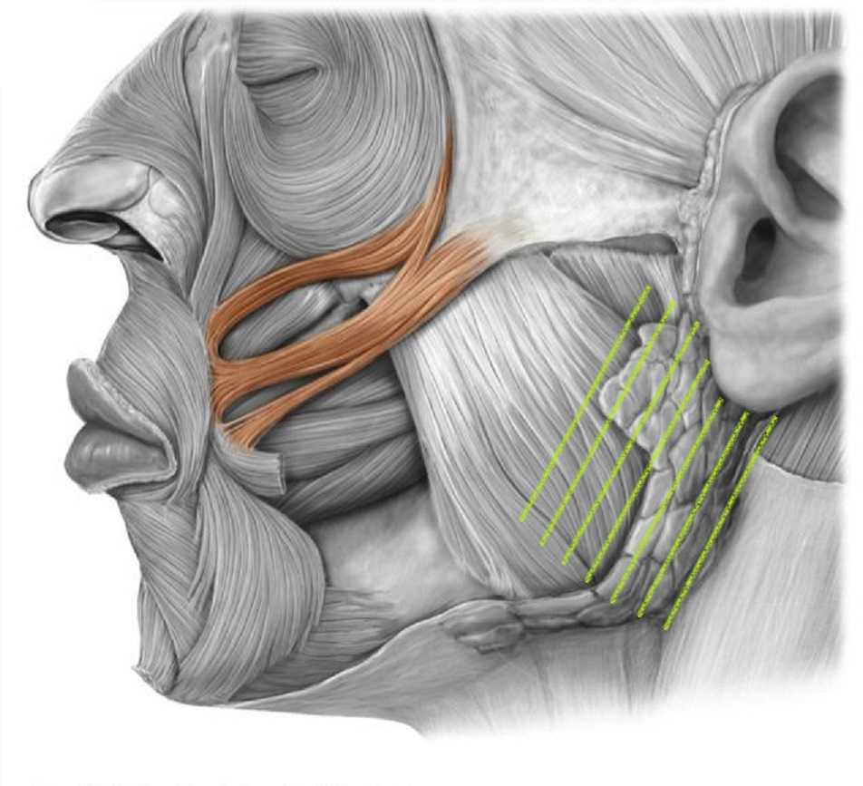 Чуть ниже наружного слухового прохода из височной кости в глубокую часть околоушной железы входит лицевой нерв, идет вниз и кпереди, вблизи занижнечелюстной вене разделяется на пять ветвей «гусиной лапки». Ветви лицевого нерва огибают снаружи занижнечелюстную вену и околоушный проток и распространяются кпереди параллельно коже. Граница между поверхностным и глубоким отделом околоушной железы проходит в плоскости ветвей лицевого нерва. На УЗИ лицевой нерв не определяется, поэтому как УЗИ-ориентир, разделяющий поверхностный и глубокий отделы околоушной железы, используют занижнечелюстную вену.