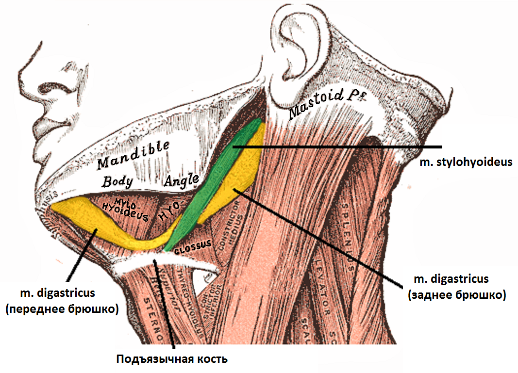 Двубрюшной мышцей называют сухожилие, которое соединяет заднее и переднее брюшко, крепится к большому рогу и телу подъязычной кости с помощью фасциальной петли.