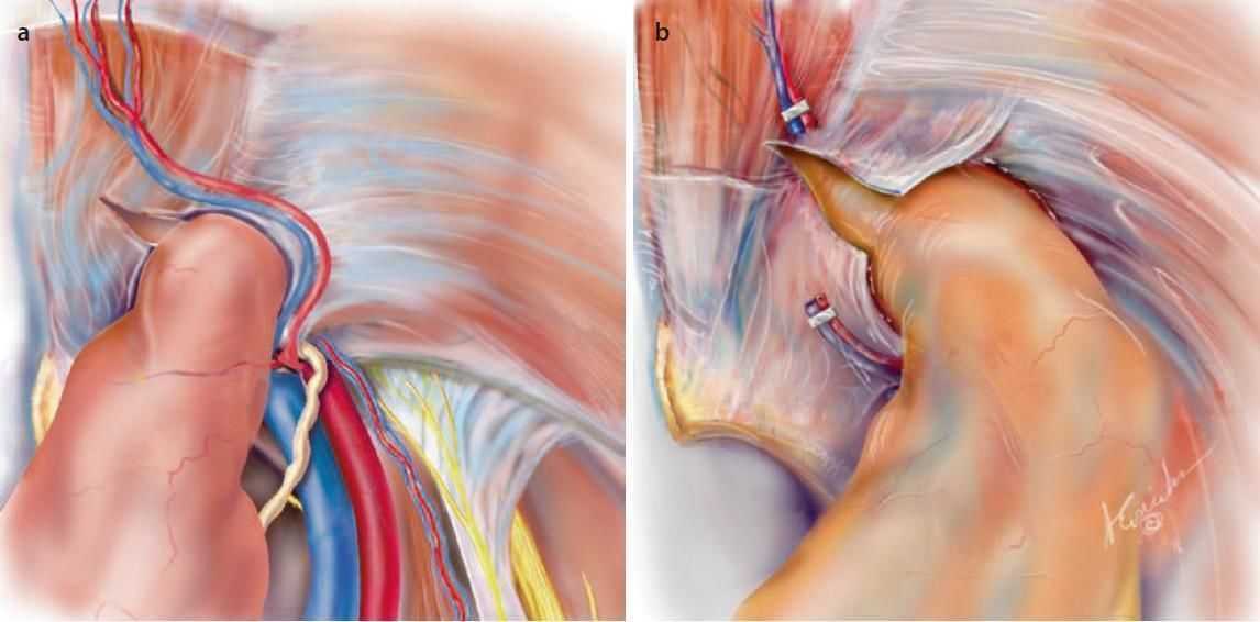 Рисунок 5 | Послабляющие разрезы в поперечном положении «10 часов» при ущемленной прямой (а) и непрямой (b) грыжах.