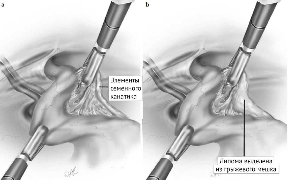 Рисунок 4 | Выделение из грыжевого мешка элементов семенного канатика (а) и липомы (b)