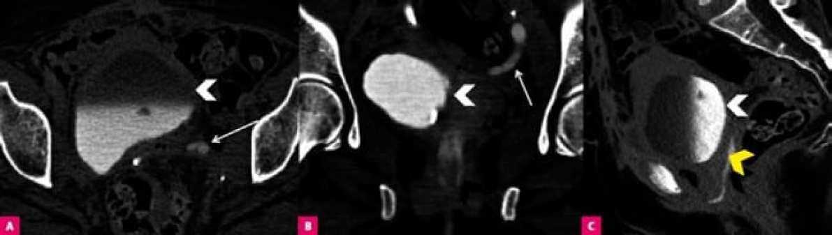 Уретеро-вагинальный свищ у женщины после операции по поводу рака шейки матки. КТ-изображения в осевой (A), фронтальной (B) и сагиттальной (C) плоскостях показывают контрастную мочу в мочевом пузыре (белая стрелка) и заполненную контрастом полость между мочеточником и влагалищем (желтая стрелка), вкупе с расширением левого мочеточника (стрелка)