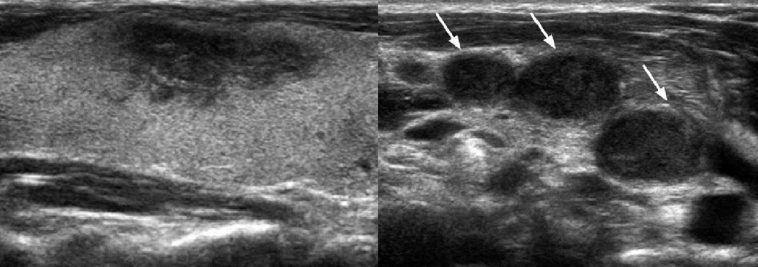 При аутоиммунном тиреоидите на УЗИ паренхима гипоэхогенная, грубонеоднородной за счет узелков (2-6 мм) разной эхогенности, неправильной формы. Очаги изоэхогенные к ткани слюнных желез пока не вовлечены в воспаление; в резко гипоэхогенных фокусах воспаление максимально выражено; в гиперэхогенных округлых или линейных структурах произошло замещение паренхимы на соединительную ткань. При тиреоидите Хашимото аномальная УЗ-картина сохраняется на протяжении всей жизни пациента. Подробнее смотри Аутоиммунная щитовидная железа на УЗИ (лекция на Диагностере).