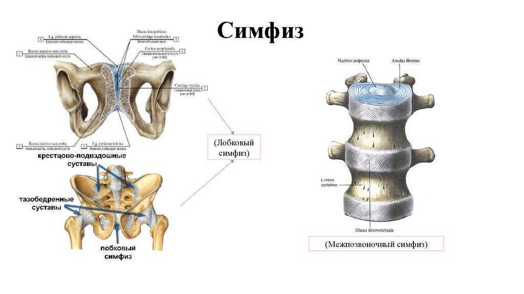 В этом типе соединения суставные поверхности костей покрыты суставным (гиалиновым) хрящом, который, в свою очередь, срастается с промежуточной подушкой, или пластинкой, из фиброзного хряща, являющегося основным соединительным материалом. Поскольку фиброзный хрящ сжимаем и эластичен, он действует как амортизатор и допускает ограниченное количество движений в суставе. Симфизы — это амфиартродиальные суставы, характеризующиеся прочностью и гибкостью. Например, лобковый симфиз представляет собой соединение правой и левой лобковых костей посредством межлобкового диска, в то время как тела смежных позвонков соединяется посредством межпозвонковых дисков (между позвонками возможны незначительные движения, однако общий эффект всех межпозвонковых дисков дает позвоночнику значительную мобильность).