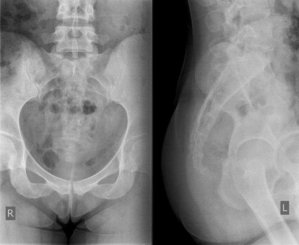 Рентгенологическое исследование помогает визуализировать аномалии, которые невозможно увидеть невооруженным глазом. О травмах копчика можно только догадываться, но окончательный диагноз можно поставить только на основании множественных проекционных рентгенограмм. Показ данных скрининга