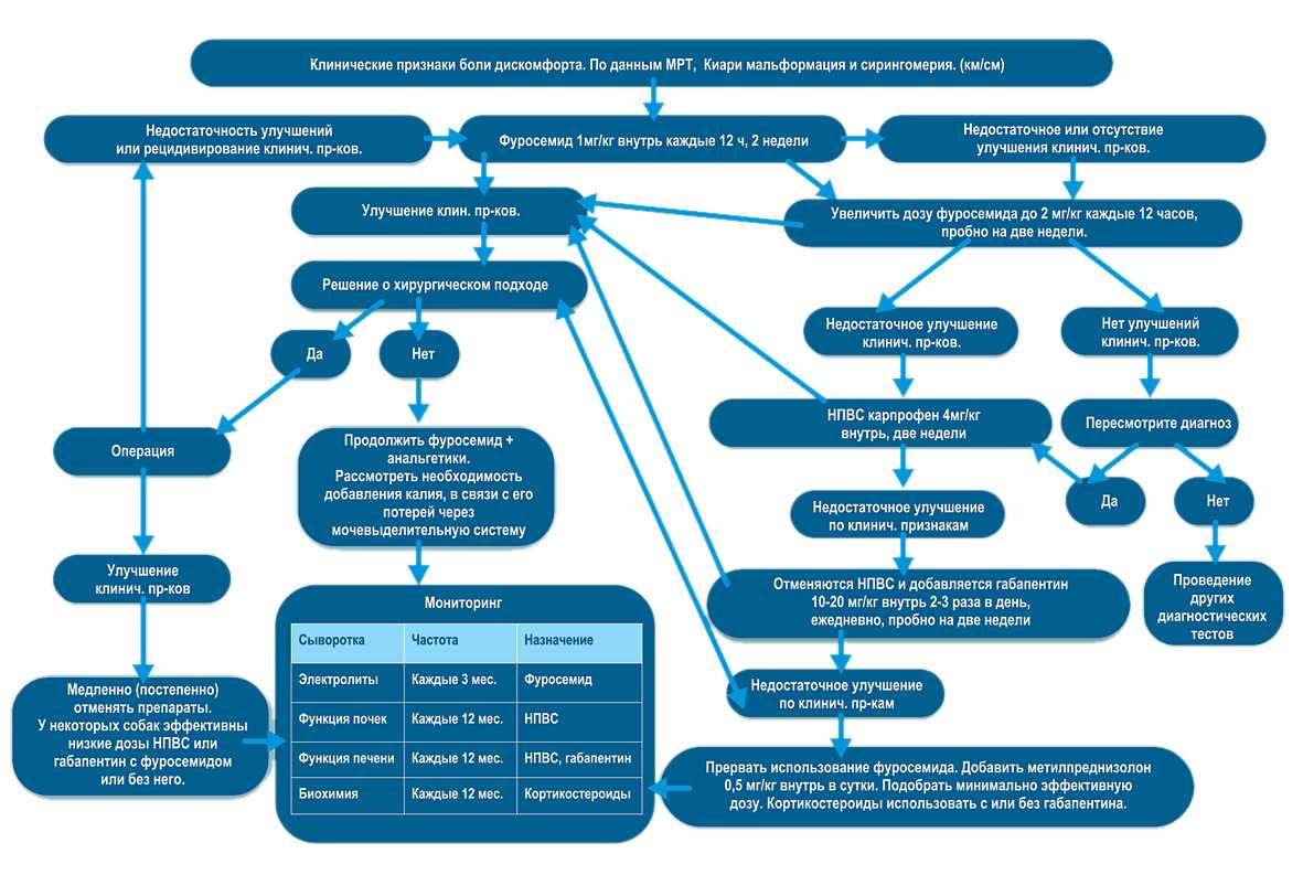 Также существует предложенный алгоритм проведения лечебных мероприятий при киари подобном пороке и сирингомиелии у собак ( приложение ). (Rusbridge C, Jeffery, NJ: (2007)