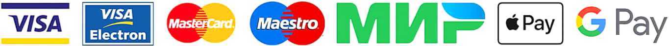 Принимаются к оплате пластиковые карты MasterCard, VISA, Maestro, МИР. Также доступна бесконтактная оплата картами Apple Pay, Google Pay и Android Pay.
