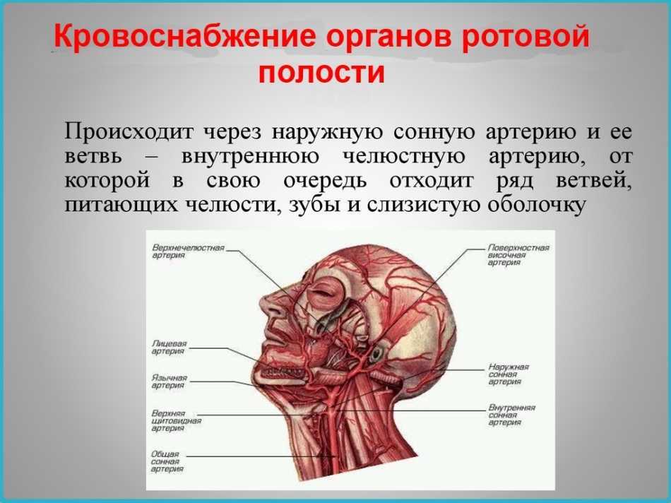 О кровообращении в челюстях человека можно сказать, что верхняя и нижняя челюстные артерии — ветви сонной артерии. А венозная кровь из челюстей в последующем оказывается в яремной вене.