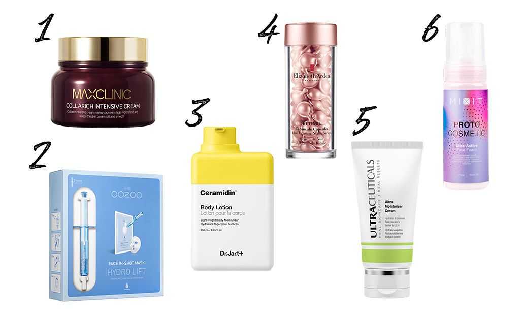 1 — крем с коллагеном и церамидами для повышения упругости кожи лица, Maxclinic, 2 — набор масок с церамидами для интенсивного увлажнения кожи лица, The Oozoo, 3 — Лосьон для тела с церамидами, Dr.Jart+, 4 — ночная сыворотка против морщин с церамидами и ретинолом, Elizabeth Arden, 5 — увлажняющий крем с церамидами и гиалуроновой кислотой, Ultraceuticals, 6 — очищающая пенка с церамидами для возрастной кожи лица, Mixit