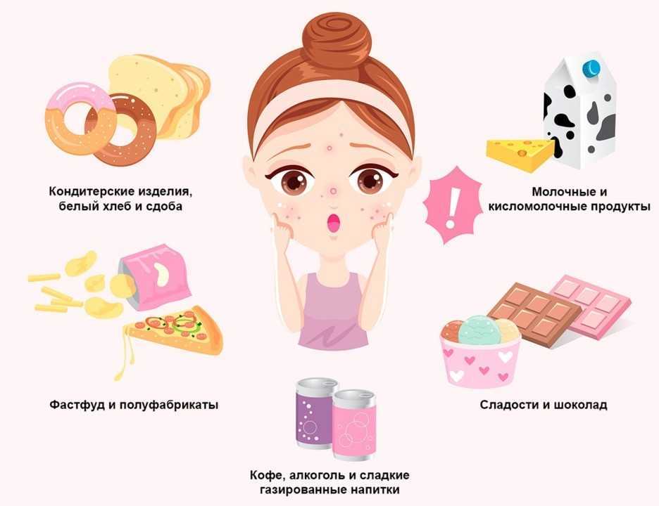Коррекция питания при комедонах подразумевает исключение из рациона продуктов, которые усиливают выработку кожного сала. В первую очередь это продукты с высоким гликемическим индексом или быстрые углеводы. К таким относятся: