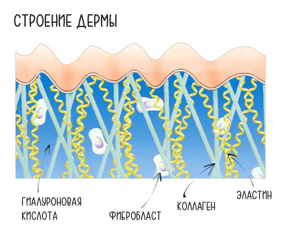 Если говорить простым языком, то дерму можно представить в виде «водно-пружинного матраса». В котором «вода» — это гиалуроновая кислота, которая способна удерживать воду. А «пружинки» — это волокна коллагена и эластина. От их состояния, переплетения и целостности и зависит состояние нашей кожи. Когда всех этих компонентов в достатке, то они образуют прочный каркас, который и обеспечивает тургор кожи.