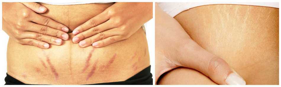 На фото: слева — начальная стадия зрелости растяжек, справа — застарелые растяжки/стрии