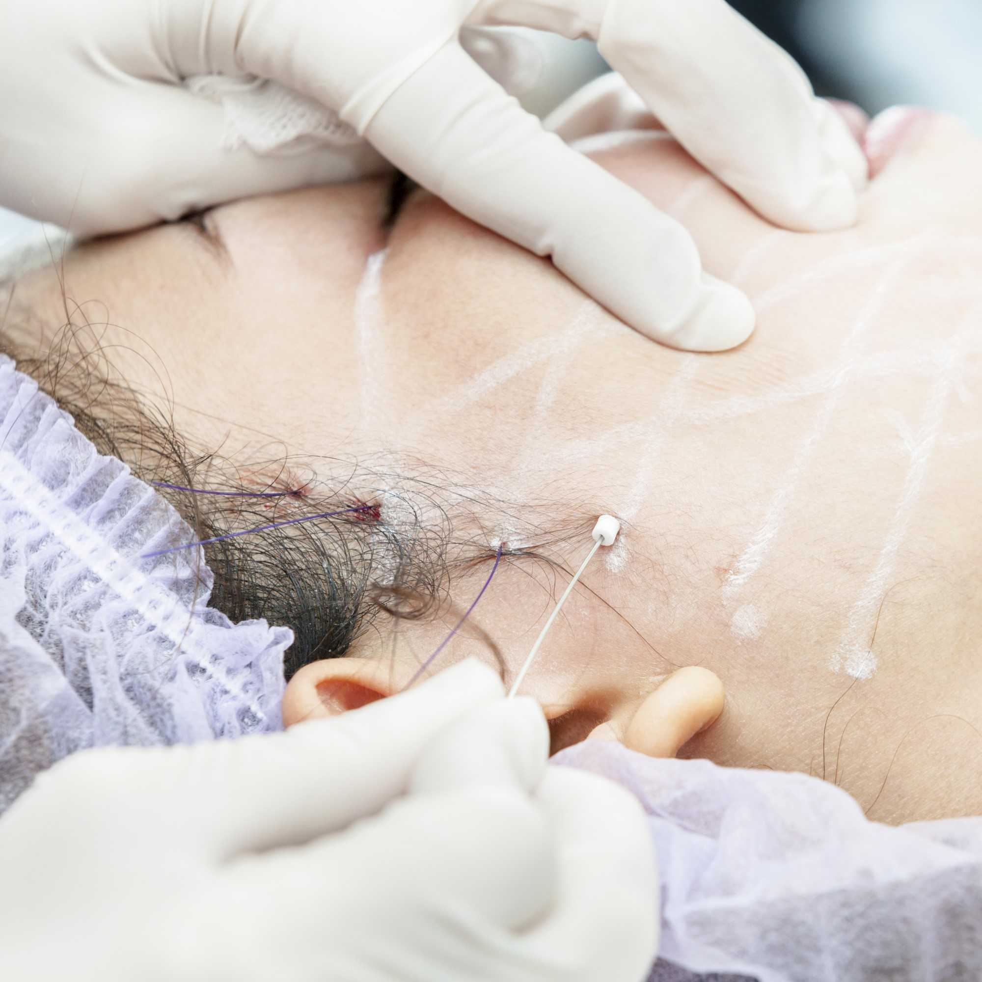 3. Собственно процедура. Пациенту вводят мезонити в заранее намеченные участки лица.